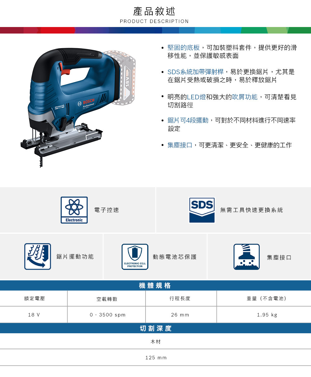 這款充電式曲線鋸GST 185-LI Professional非常適合用於在實木、鋸屑板和木材複合材料中彎曲和交叉切割,也可以切割較厚或較硬的材料。依照不同的材料應用選擇對應的轉速。具備強勁的無刷摩打與成熟可靠的的機械系統,還有足以取代有線式工具的同等級性能表現。4段循軌運動讓您可以在快速切割或精細切割之間調整效果。可調整至45°的底板,適用於斜切應用。免工具博世SDS系統使更換鋸片變得更加輕鬆。