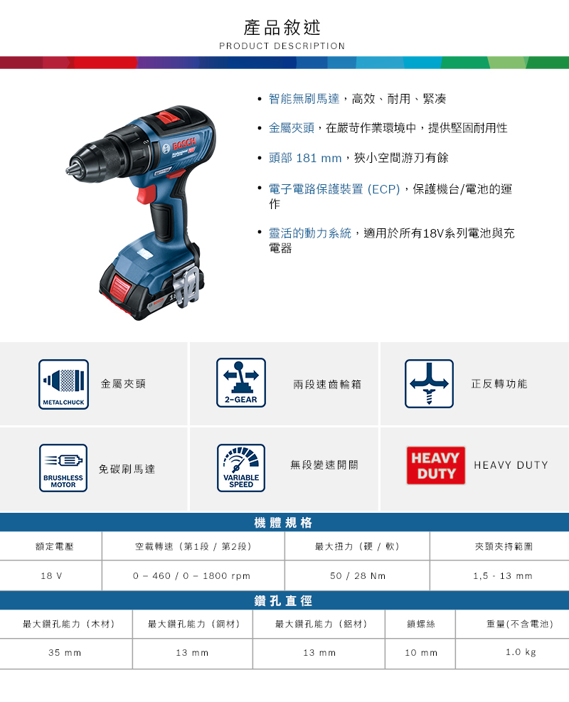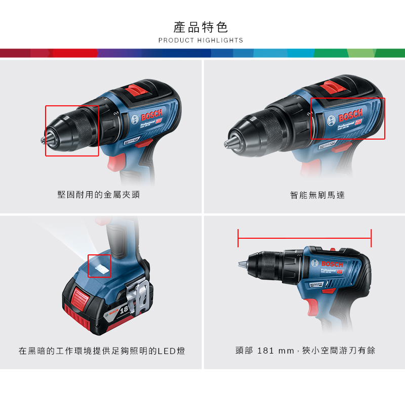• 專業18V系統可與博世所有相同電壓的電池和充電器搭配使用