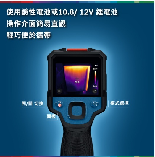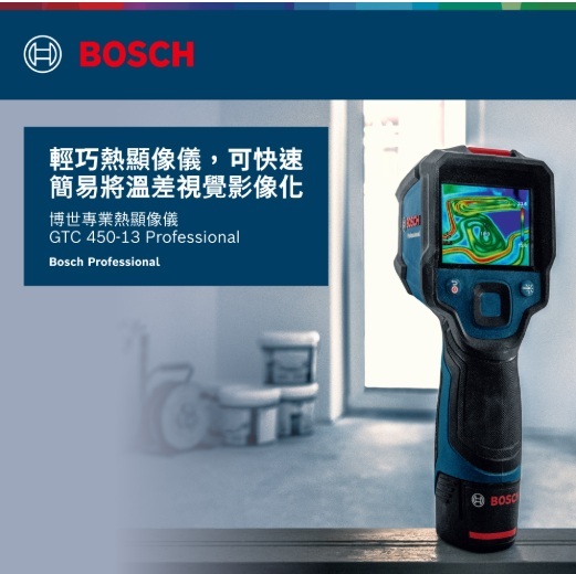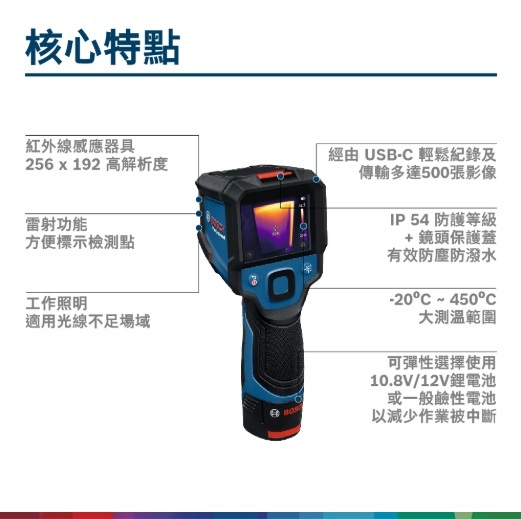 GTC 12V-450-13 Professional提供靈活的雙電源設計,方便您交替使用 BOSCH12V鋰離子電池和AA鹼性電池,盡可能縮短停機時間。USB介面讓您輕鬆擷取和傳輸多達500張影像,確保工作效率。這款熱像儀還可搭配相容的AA電池轉接器等配件使用,讓您隨時準備處理任何工作。