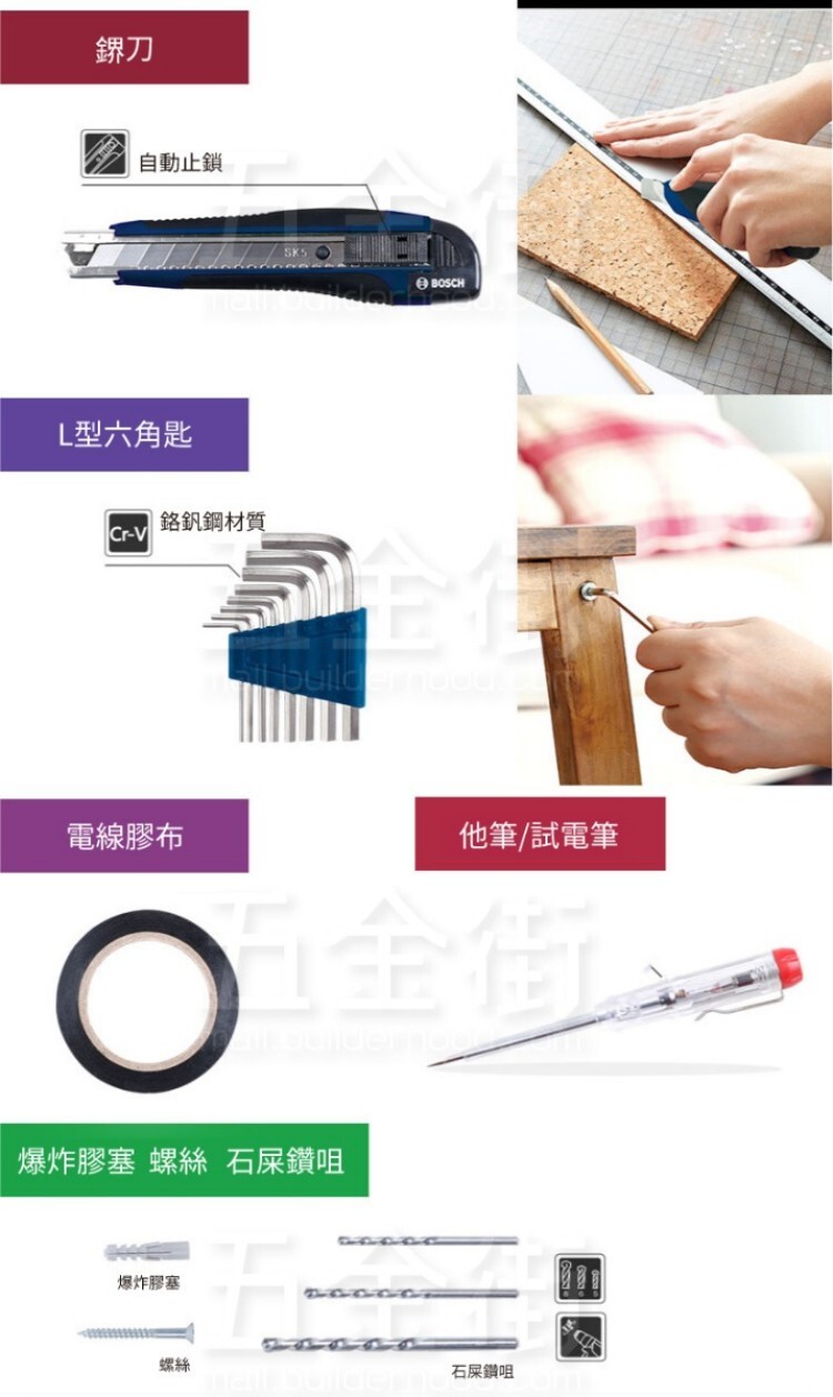 • 包括鐵鎚、鉗、士巴拿、手電筒、試電批、拉尺、鎅刀、手拉鋸、石工鑽咀、套筒、批頭等常用工具與配件